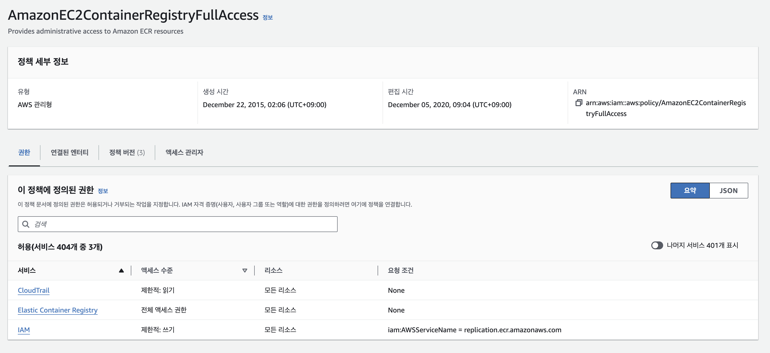 ECR에 이미지를 업로드하고 다운 받기 위해서는 컨테이너 관련 권한이 필요하다. ECR 관련해서는 AmazonEC2ContainerRegistryFullAccess에 필요한 권한이 있으니 참고하자. (생성한 IAM 계정의 키 페어는 잘 기록해두자)