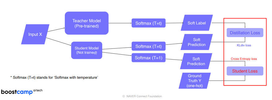이미 학습 된 큰 모델을 학습 시키고자 하는 작은 모델이 따라하는 방식으로 학습이 가능하다. 학습된 모델로 unlabeled 데이터셋을 pseudo-label을 주고, 이를 바탕으로 학습하는 방법으로 사용한다. 피어세션에서 pseudo-labeling은 언제 사용하는 것이며, 정말 효과적일까 하는 질문이 있었다.(정확히는 soft lable을 활용해서 학습하는 것, pseudo label과는 약간은 다르다.)